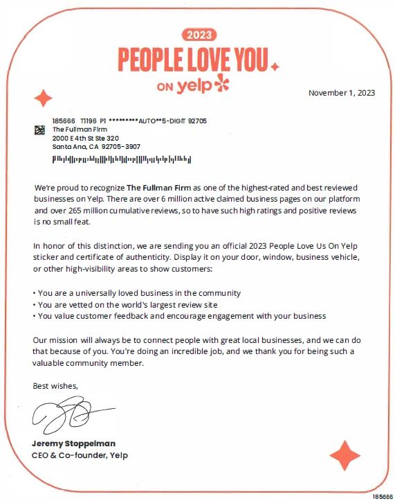 Yelp’s acknowledgement comes with the coveted 2023 “People Love Us On Yelp” sticker and a certificate of authenticity. These symbols of trust and excellence are not just accolades but also testaments to The Fullman Firm’s unparalleled service and its position as a universally loved business in the community. The firm is recognized for its commitment to customer feedback, encouraging active engagement, and maintaining a strong presence on the world’s largest review site.